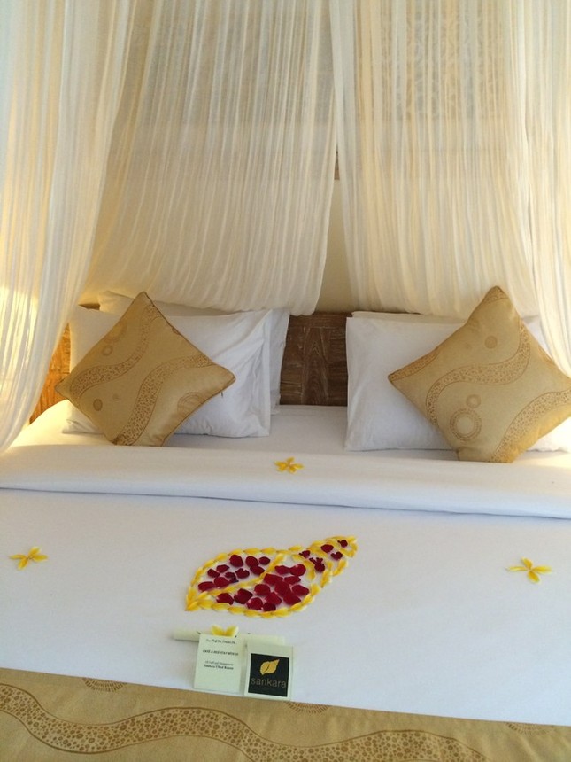 这家酒店的名字的确很“山卡啦”——SANKARA,位置有些偏僻,但是酒店有车可以接送我们外出。看到小无边泳池的时候,开心坏啦。嗯,提醒一下各位,不知道为什么泳池边上有些小虫。不过下去拍拍照什么的还是挺好看的。 我们住在二楼,一整层。很安静。一栋楼就两层,我们在二楼刚好有个大屋顶,好喜欢。进门前看到木楼梯上有些蚂蚁在旅游,不过它们很和谐,没有进门。所以房间里还是很干净整洁的,阳台外看到的是一些田,不过不影响加分。只能说去到哪都能见到鸡蛋花,太喜欢了。不到八百人民币的房间迷倒了我,浴室更不用说了,有个小天窗。 这个酒店可以预约免费的spa,好像是半小时。酒店安排的早餐,不习惯,不好吃。