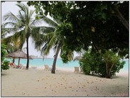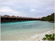 马尔代夫满月岛 是最早对中国游客宣传的酒店之一,虽然可能不如现在新开发的岛屿那么多新意。但老牌的酒店也有它自己的特色。我觉得这里就性价比挺高:价格适中,酒店服务和设施都挺有保证,饭菜味道也不错,沙滩坡度平缓,不用出海也能自己下水浮浅。而且特别适合不会英语的人来,有中国服务生和中文菜单哦。 酒店提供了蜜月装饰,还有欢迎红酒和甜点,水果。蜜月啊,蜜月,不就该是这样的吗。酒店的游泳池里经常是空空的。鲜艳的三角梅落在碧蓝的池子里,就我和LG两个人在游泳,太惬意了。在这个美丽的池子里,我终于学会了游泳。 每间水屋都有露台,直通海里。水屋的浴室是直接看到海景的。不过因为会有人浮浅经过,我还是没敢开着窗洗澡。可惜了。