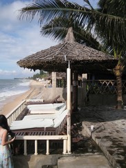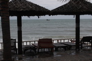 Mui Ne Backpackers Resort,新咖啡往西约2公里,下午浪小的时候有沙滩,泳池很小,正对门口,老板Tom是澳洲人,一口英式英语。我们住的是beach front room,双人间,住的三个人,预定的时候是40USD/晚,最后可能我们没用extra mattress的缘故,是35USD/晚(直接酒店官网预定,可以提前15天取消)。遗憾的是,就第一天下午和第二天早上有海滩,所以其实可以再稍微往西几家,就可以整天都享受海滩了。洗澡也都是凉水。 我们的房间是beach front,要的二人间加一张垫子,不过进了房间才发现,如果放垫子的话,房间就比较局促了,所以我们决定凑活一下三人一起睡。
