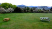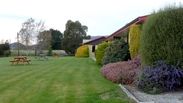 我们预定的是2室1厅的房间(厅与厨房连在一起的),房间很干净,洗澡水很大还有壁炉。由于不善使用,壁炉内点火的一些小木材烧尽后火还没有起来,房间内没有能劈材的刀,接待室已经关灯了,只能放弃使用壁炉。由于房间的布局关系,朋友只能睡客厅了,所有能抽出的被褥全给她用上了。第二天起床后发现,这个Motel的环境真不错有一片很大的草地,树枝修剪的很整齐,植物的色彩也是精心选择过的。