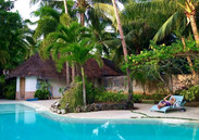 离锡基霍尔码头9公里,在San Juan(圣胡安),位于岛的西南部,坐三轮车大约20多分钟就到了,砍价到200P/车。Coral Cay Reosrt酒店总共只有15间房,客人并不多,不像一些度假村熙熙攘攘的,显得很宁静。房间是用竹子和茅草等材料搭建的,空间宽敞明亮,设施齐全,每天卫生打扫得很干净。木质地板、空调、保险箱、餐桌和冰箱一应具全我们订的7号房就建在沙滩上,推开门就是一望无际的大海。 晚上坐在沙滩上,我们被漫天星斗彻底地震撼到了。可惜我们的相机无法拍出效果。房间门口沙滩的椰子树上挂了一根粗绳,上面隔半米结了一个绳结,可以当作是秋千荡着玩儿。下午几个当地小孩在玩耍。他们好好的给我们秀了一把他们的拿手绝技。酒店的泳池游不大,干净程度还是可以的。桌球、健身房供客人免费玩和使用。二面书柜摆满书籍。