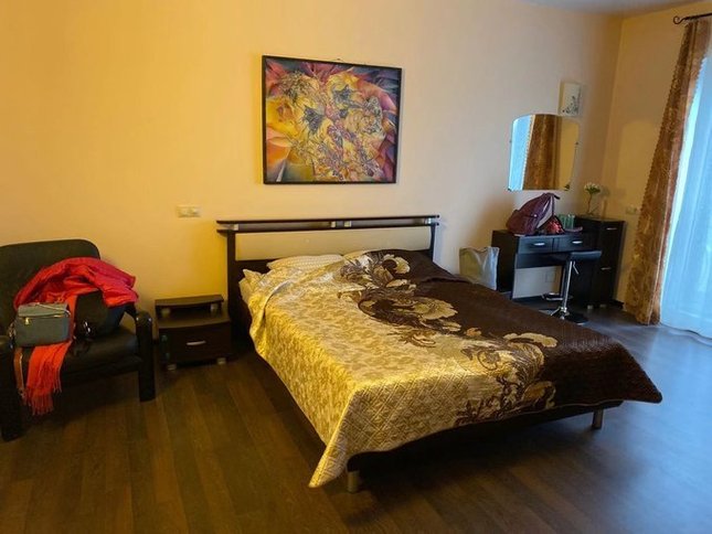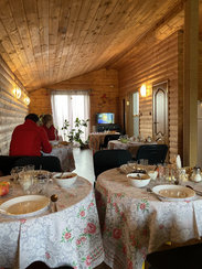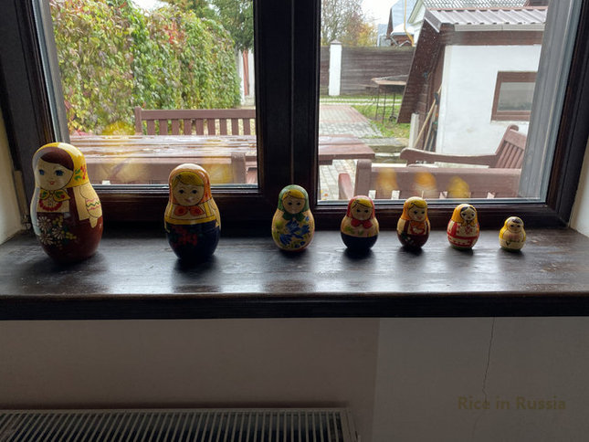 民宿没有任何标志,没有门铃。大米透过玻璃窗瞧了瞧,空无一人。一拧门把,开了!走进屋内,开了几个门,看不到人。电话给房东。房东让她们等几分钟。过了会,一位白发苍苍的老奶奶出现了。她带到二楼的房间,熟练地用手机谷歌翻译介绍屋内的设施。她对着手机说俄文,转换成普通话播放。老奶奶人很和善,常带着亲切的笑容。才明白,网页上说的通晓中英文的前台是老奶奶的手机翻译。 老奶奶在楼上客厅摆了四五桌,为住客准备了丰盛的早餐:有面包、泡芙、土豆、煎蛋火腿、麦片粥、各式饮料、苹果等等。苹果味道不错。可能是她自己种的。