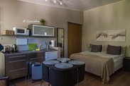 评论上说房东的态度好像不是很好。从他给我们发的消息中也能看出来,发了三次,就两个字“No cooking"。我们预定的是二层楼的Deluxe Family Room,不过我们到达的那天,他说给我们升级到Studio,就是自带厨房的一间底层的小屋。感觉他是个很谨慎的人,还进来看了下,问他既然这里有炉灶,我们是不是可以做饭,他应许了,但还说,所有的东西烧完之后要恢复原样,包括厨具餐具要擦干了以后才能放回柜子 我们说可以,他就离开了。小屋子还不错,一个大床一个沙发床,四个人住有点挤