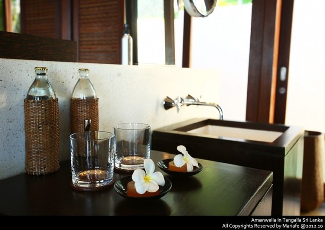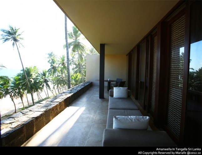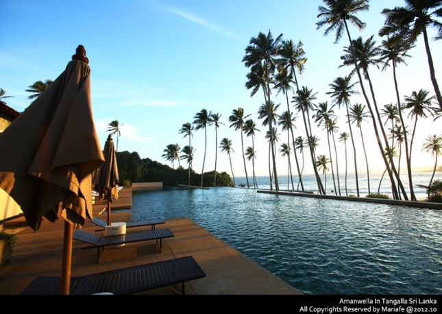 酒店经理一早就等在了门口,送上了Welcome Drink,在确认了我的朋友不来后帮我把房间升级到了Ocean Pool Suite。 Butler把我送到房间,Amanwella并没有让我一眼的惊艳,甚至从Tea Trails到这里后还有些微微的失望一切似乎显得不是那么特别,但是Aman始终还是Aman,即使没有那一眼的惊喜,点滴的细节却总是能渗入人心 。 房间比Tea Trails的大了很多,一个人住空旷得有一些清冷 。开放式的卫生间,四面都是落地玻璃窗,一面泳池,一面大海,边上厕所边看海算不算人生的恶趣味? 房间外的露台很大,离开海很近,站在那里能够闻见海水特有的味道,带着一点点潮湿扑面而来,坐在椅子上写日记,寂静地整个世界都只剩下你,还有那一阵又一阵撩拨心弦地海浪声 。 常常怀疑Amanwella是没有住客的。一个人晃遍了整个酒店都没有遇见一个住客,酒吧也空空荡荡。夕阳下的泳池是不是Amanwella最美的时刻? Check-in的时候在房间里,Check-out却是在前台,服务员给我账单的时候看见刚才的那顿午餐折合人民币才135块时,极其诧异,再三和服务员确认是有Discount而不是算错了价格。在Amanwella这样的消费水准,估计全世界都绝无仅有了吧。经理出来送别,给了份小礼物,袋子里还装了两瓶水。喜欢Aman,大概就是因为这些不起眼的小细节。
