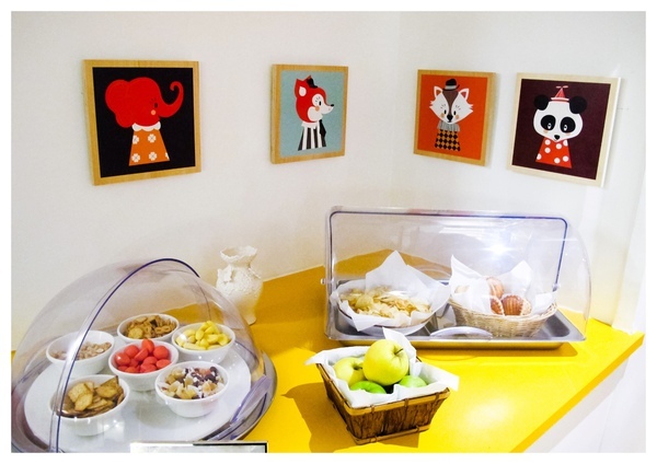 早餐区鲜艳的很可爱呀~~很贴心的为了有小孩的旅客准备了儿童游乐区。大厅里每日下午提供茶点让入住的旅客享用有水果、坚果、饼干、糖果以及小糕点也提供茶包、咖啡包 还有新鲜现榨的100%柳橙汁。