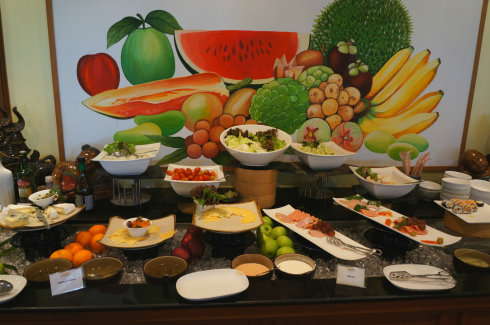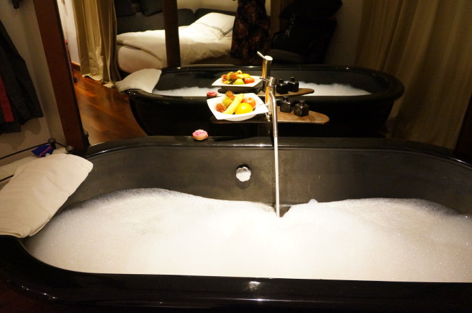客房隐蔽在树林环绕的建筑体中,带着点神秘气息,门是扇铁门,不是发着光的豪华版铁门,是旧旧的暗灰色,有些像使用多年后废弃的锅炉的颜色,门嵌在砖红色的墙壁中,有种古老的气质。客厅的浴缸不是想象中那种竹筒式的,但和整个房间的神秘钢色设计还是很搭配。早餐式样很丰富,中式西式任君选择